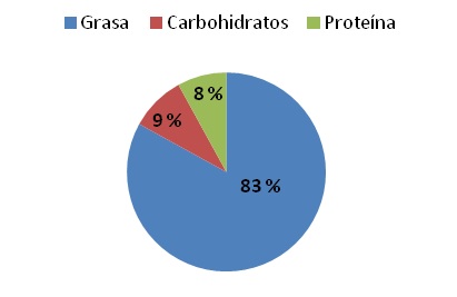 Por calorías, las nueces se componen de un 83 % de grasa, un 9 % de carbohidratos y un 8 % de proteína.